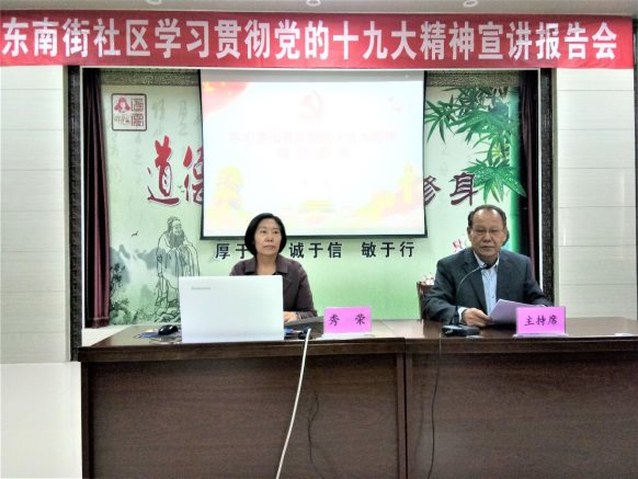 秀荣从党的十九大的主题、成果、主要精神、认真学习宣传贯彻十九大精神等方面,运用图文并茂的PPT课件,对党的十九大精神作了系统、全面、准确地宣讲。秀荣指出,党的十九大是在全面建成小康社会决胜阶段、中国特色社会主义进入新时代的关键时期召开的一次十分重要的大会,是一次在新的历史起点上开启党和国家事业新征程的大会,是一次不忘初心、牢记使命、高举旗帜、团结奋进的大会。